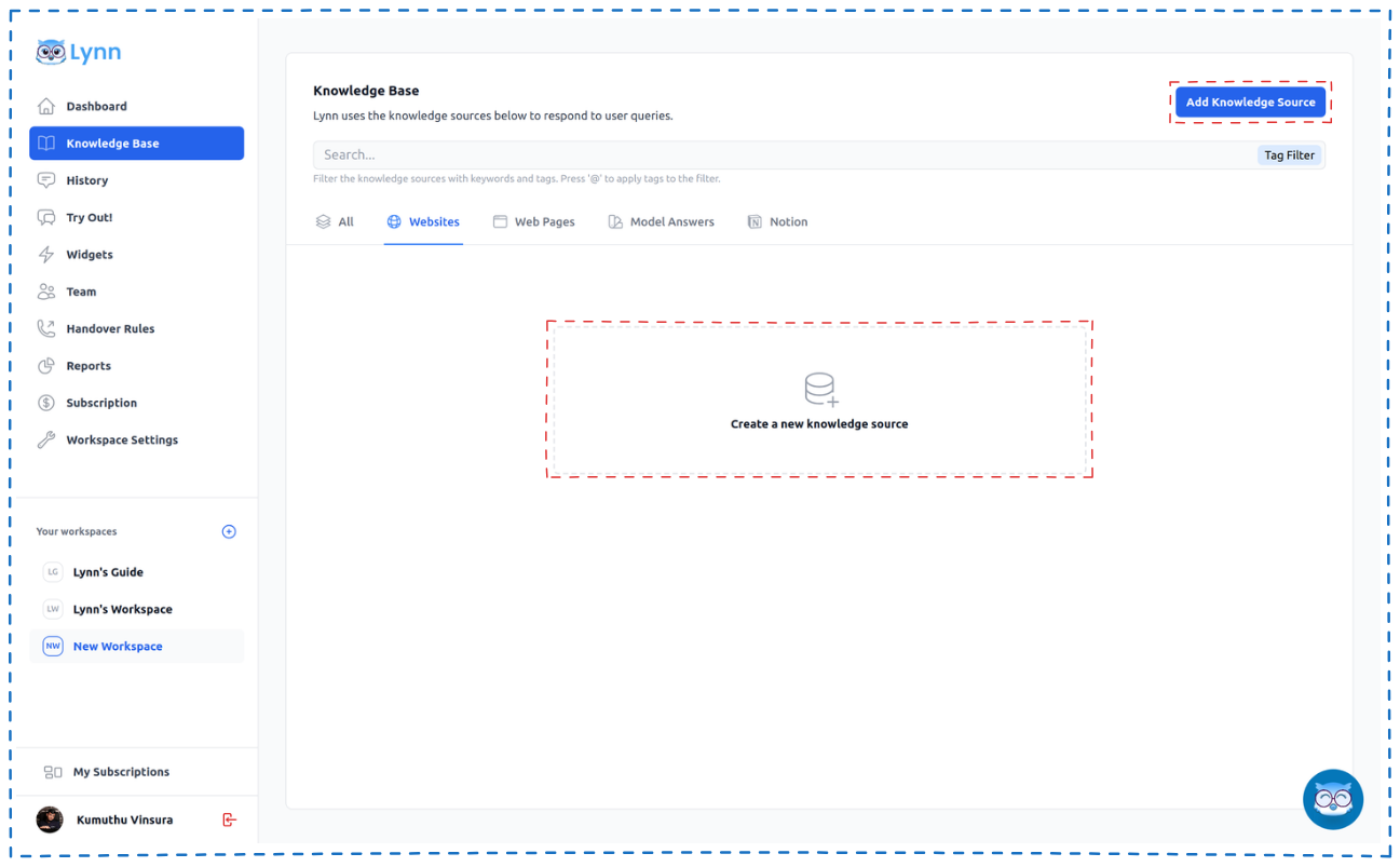 To start creating a knowledge base in Lynn, click on the “Create a New Knowledge Source” block or the “Add Knowledge Source” button in the top right corner.