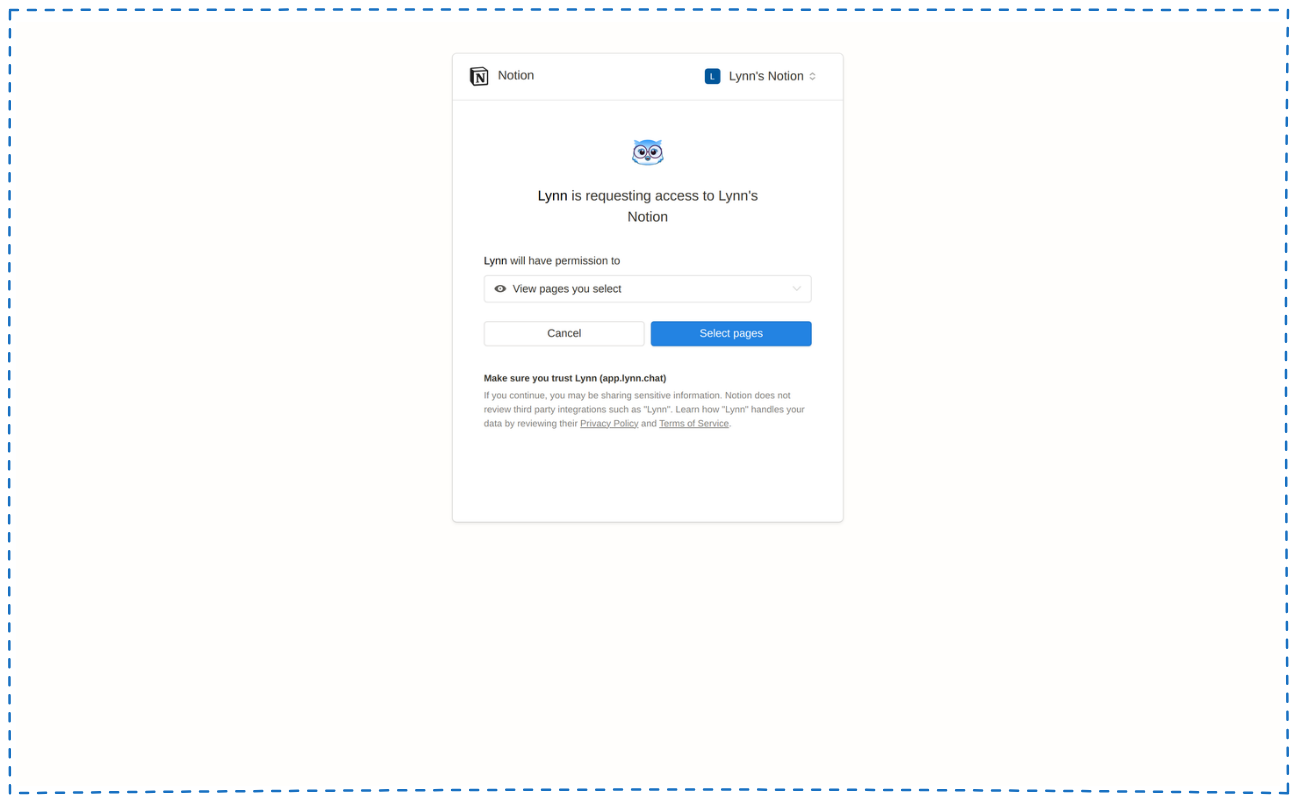 <figure><img src="https://2762017608-files.gitbook.io/~/files/v0/b/gitbook-x-prod.appspot.com/o/spaces%2FWsuD6nsscVhXqYf6UuRj%2Fuploads%2FmM8b73QMBWurSY76CrTr%2FUntitled-2023-11-25-2030%203.png?alt=media&#x26;token=d1c80fb7-6a69-409b-8607-e04d813b868a" alt=""><figcaption><p>Connect Notion: Select pages and grant access to Lynn to add the selected pages as the knowledge source.</p></figcaption></figure>