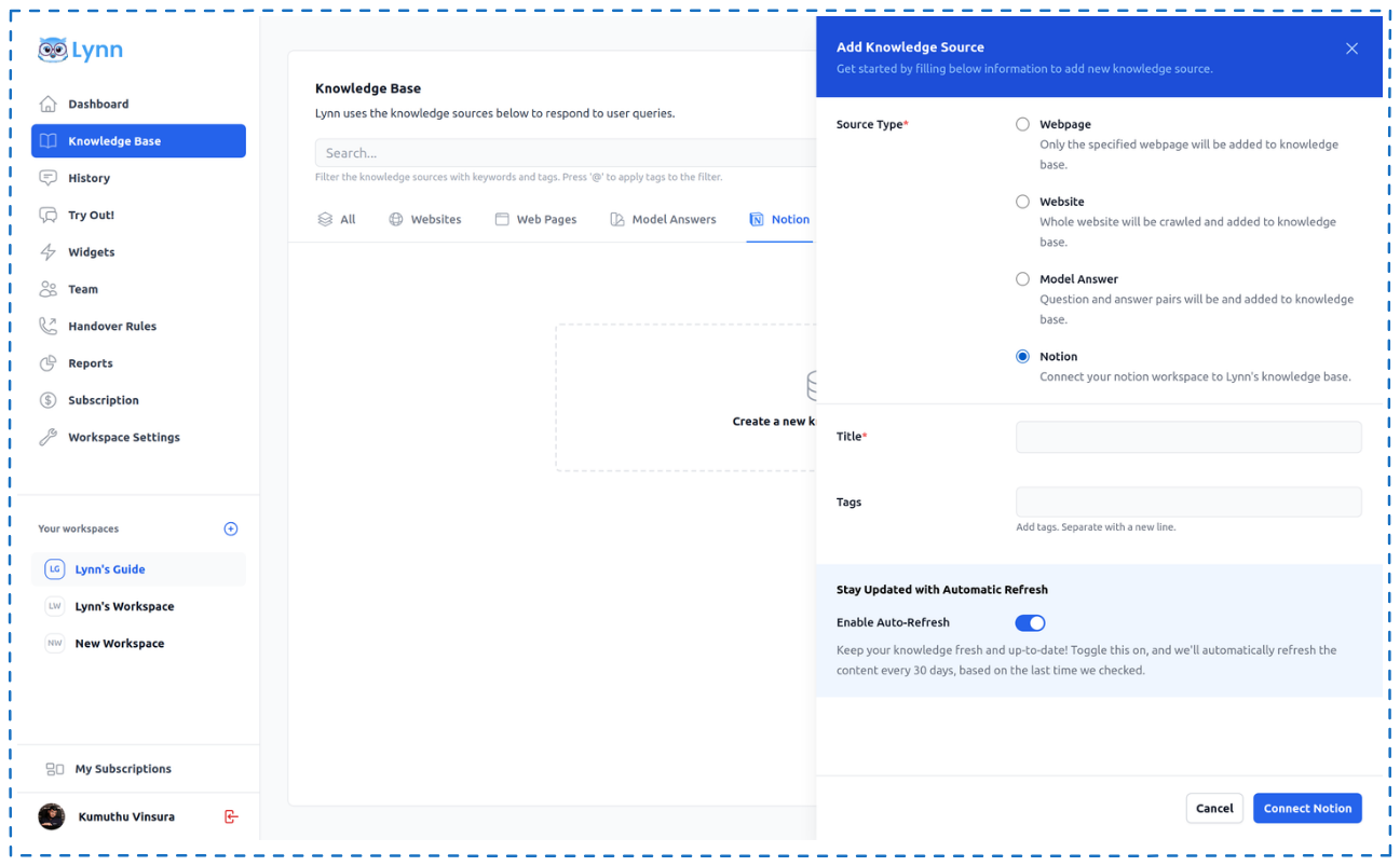 * **Notion:** In this section, you can connect directly to your Notion workspace to manage access for the pages that Lynn should include in the knowledge base. Once you select “Notion” you will see a button called Connect Notion in the bottom right corner. After clicking on it, you will be redirected to a page where you can select the pages that Lynn should access to pick up the knowledge.