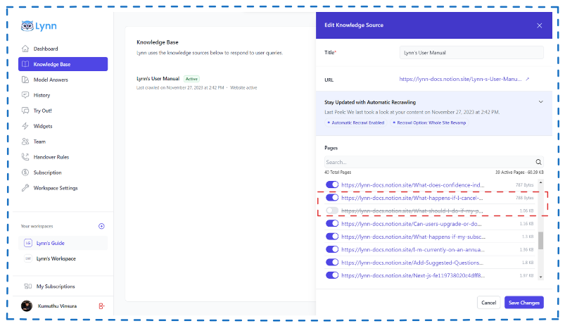 Once Lynn has gone through your website, you can still choose which links to include or exclude in your knowledge base. Simply use the toggle associated with the webpages listed in the “view source” section to make your selections (Only available with the website knowledge source).